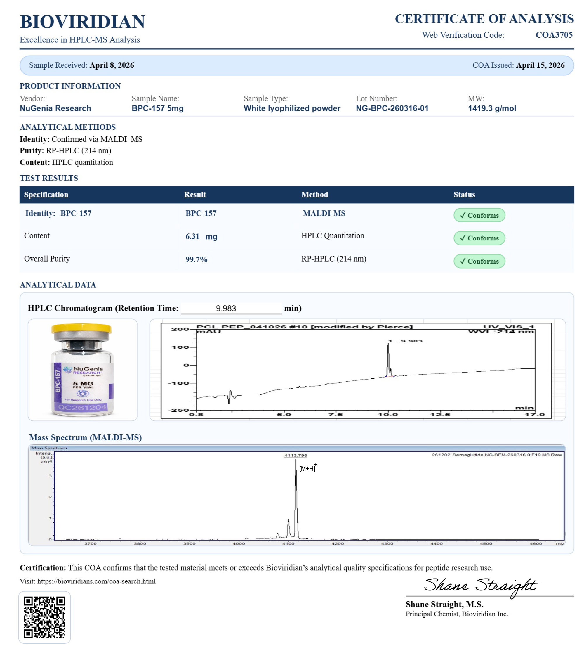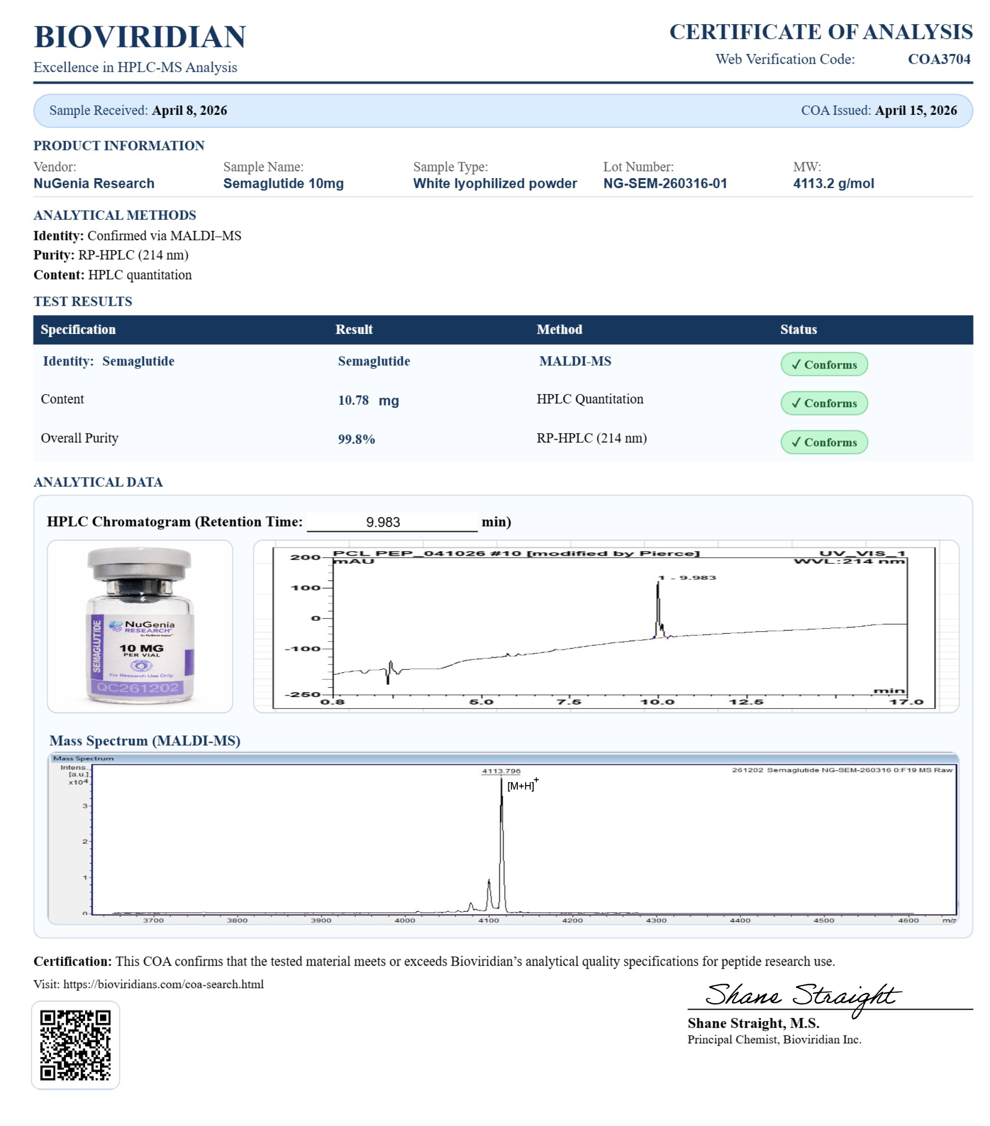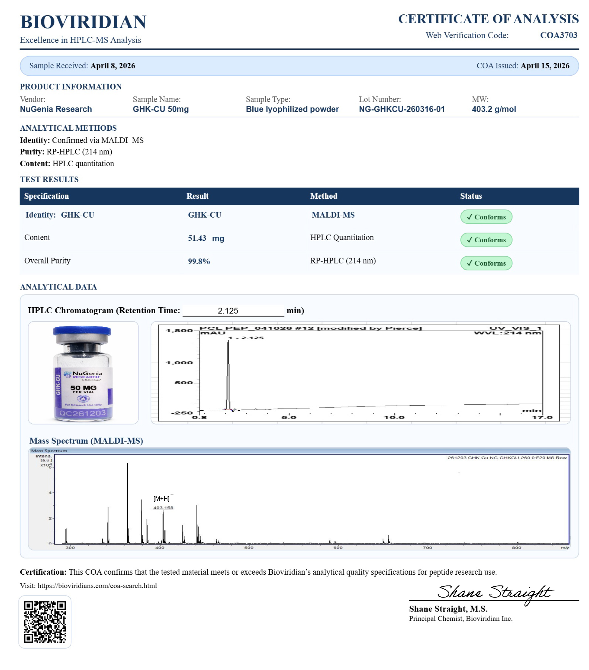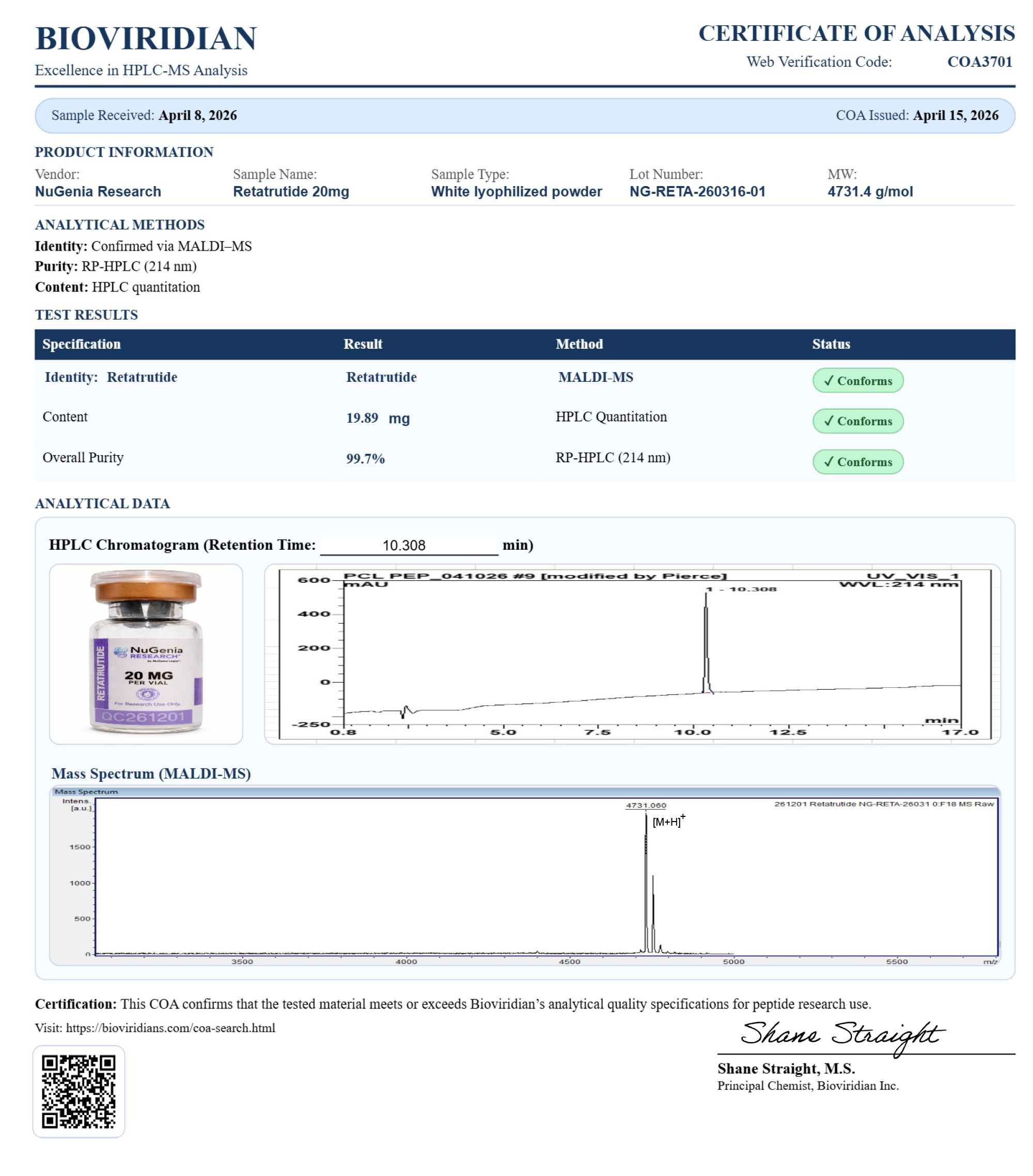 Welcome to the NuGenia Logics™ COA Validation Portal. Make sure your product is genuine by viewing its Certificates of Analysis (COA) directly from our lab partner. Scan your QR code from the product label or select your batch number below to view the COA.